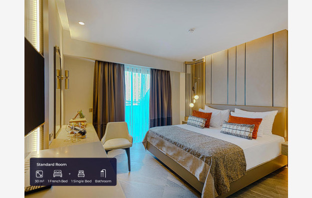 Standard sobe sa pogledom na kopno /delimičanim pogledom na more (30m2). Sadrže francuski ležaj i jedan singl ležaj. Maksimalno mogu da borave tri odrasle osobe.