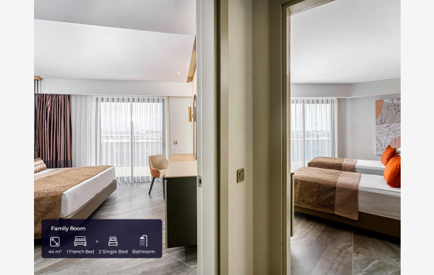 Family sobe sa ppogledom na kopno/pogledom na more (44m2). Sastoje se iz dve prostorije odvojene vratima. Sadrže francuski ležaj i dva singl ležaja. Maksimalno mogu da borave tri odrasle osobe i jedno dete do 13 godina.
