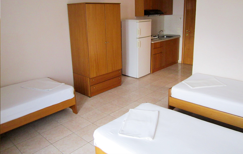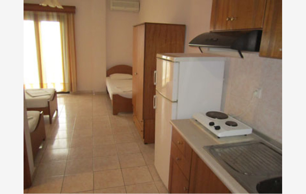Opis: Poseduje dvokrevetna I trokrevetna studija, koja se nalaze na drugom spratu i većina njih ima bočni pogled na more. Sva studija imaju opremljeni kuhinjski deo, kupatilo/wc, terasu, TV, WiFi internet i klima uređaj (uz doplatu na licu mesta od 7€ dnevno).